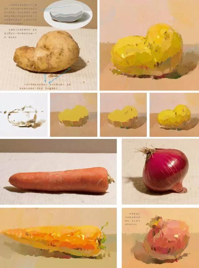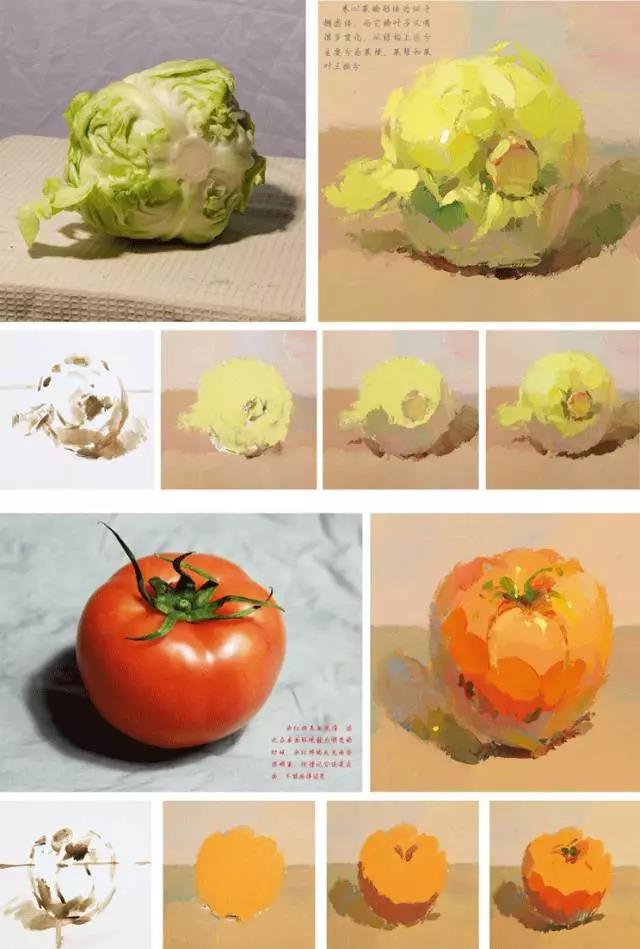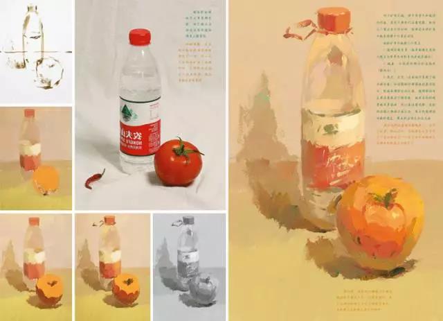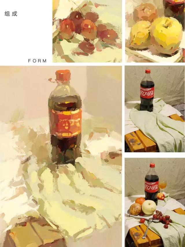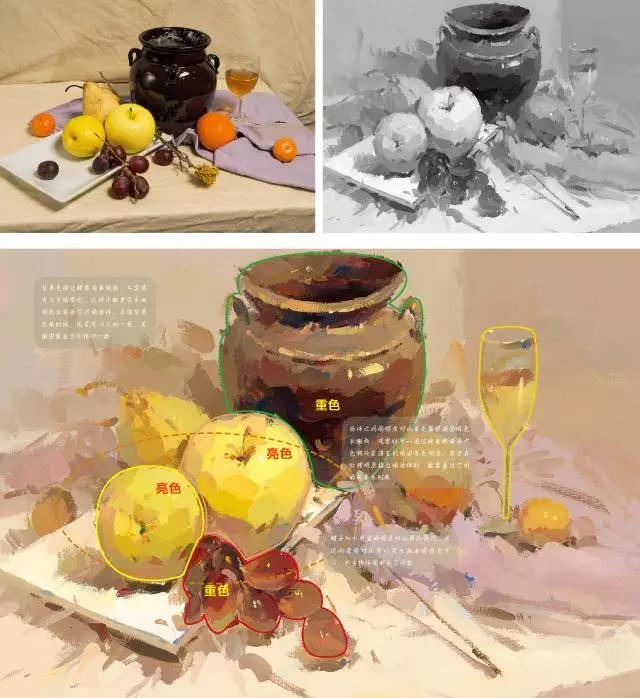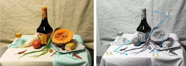 例如:我們首先可以觀察一下,在襯布與物體中,哪種色彩占的比例大,襯布的色彩傾向與主要靜物的色彩是協(xié)調(diào)還是對比的關(guān)系。