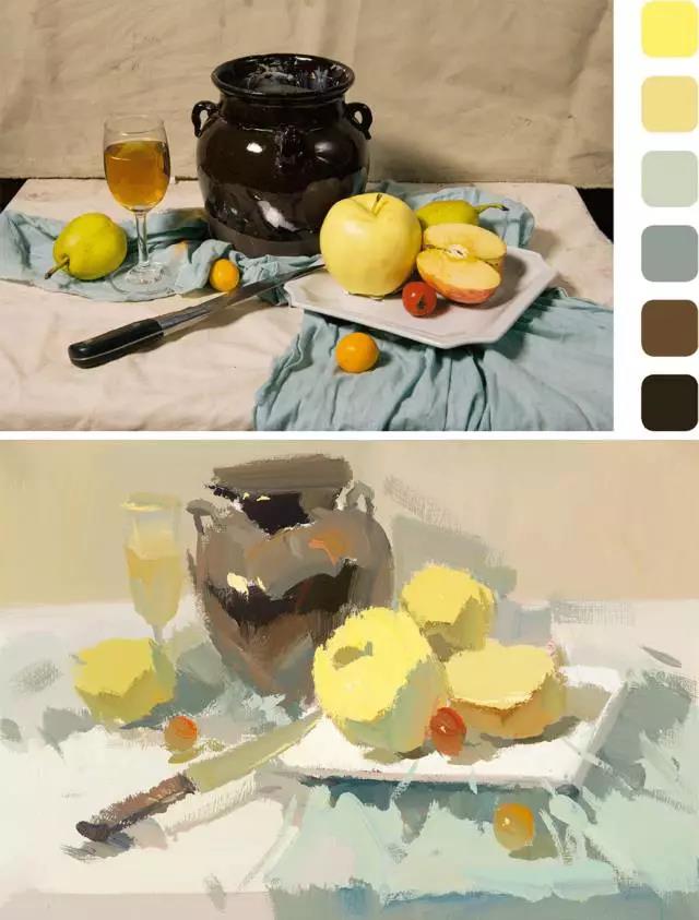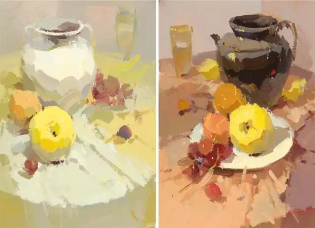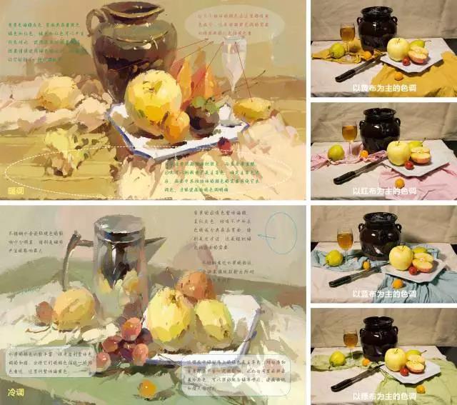 如果襯布與主要靜物的色彩屬同類色系的范圍,那么就基本決定了這組靜物的色調(diào)傾向,占據(jù)畫面主要位置大面積的襯布顏色就構(gòu)成了該畫面的主要色調(diào)。