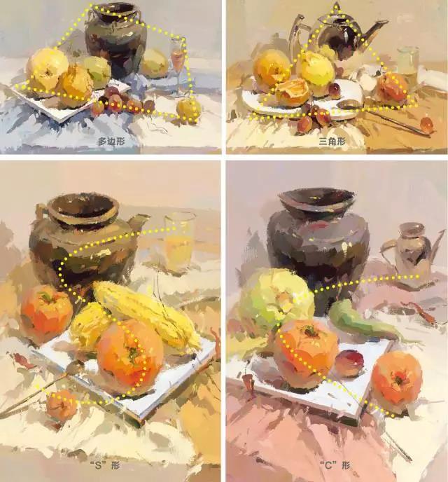 靜物的擺布與組織通常是在以大面積的具有某一色彩傾向的襯布基礎(chǔ)上,或某以物體占據(jù)主控位置的基礎(chǔ)上,配以一些具有其他色彩的小面積的襯布,以此與主要物體產(chǎn)生對比關(guān)系,從而活躍畫面。