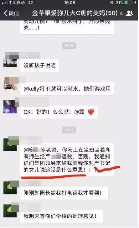 在成都某高檔幼兒園就讀的一位小女孩,經(jīng)常打班里的小朋友,老師決定給她單獨(dú)安排座位,遭女孩家長(zhǎng)在家長(zhǎng)群里威脅:“陳老師,你馬上在全班當(dāng)著所有師生給嚴(yán)××道歉,否則我通知你們集團(tuán)領(lǐng)導(dǎo)來(lái)給我解釋?zhuān)銓?duì)嚴(yán)書(shū)記女兒說(shuō)這話(huà)什么意思!”